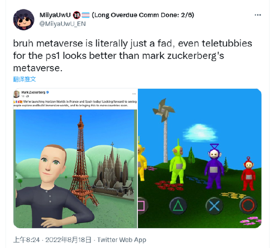 扎克伯格在脸书上传一张虚拟自拍,以庆祝元宇宙社交平台 Horizon Worlds 在法国和西班牙上线。但由于该照片建模的简陋效果引起大量吐槽,有网友认为连 PS1(1994年发布的游戏机)上的天线宝宝游戏都比该平台做得好。