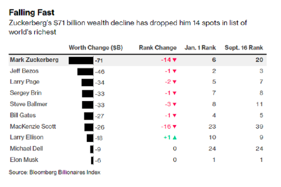槽糕的财报和艰难的转型,让扎克伯格的的身价大幅缩水。彭博亿万富翁指数显示,截至9月20日,扎克伯格身家为559亿美元,在全球亿万富翁中的排名从年初的第6位下滑至第20位,创下自2014年以来最低排名。2022年以来,扎克伯格的身家已缩水710亿美元(约合人民币4979亿元)。