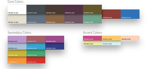 虽然我们仍然认为核心系列是基于中性的,但我们开始看到更有表现力的色调得到呈现。最上面一排有更多的传统秋/冬季应用,而最下面一排则显示了上方每一种颜色的矿物对应物。这些矿物色调将在春/夏季节的核心色彩应用中更加突出。