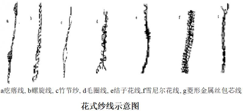 花式线(纱):由芯纱、饰纱和固纱加捻组合而成,具有各种不同特殊结构性能和外观。